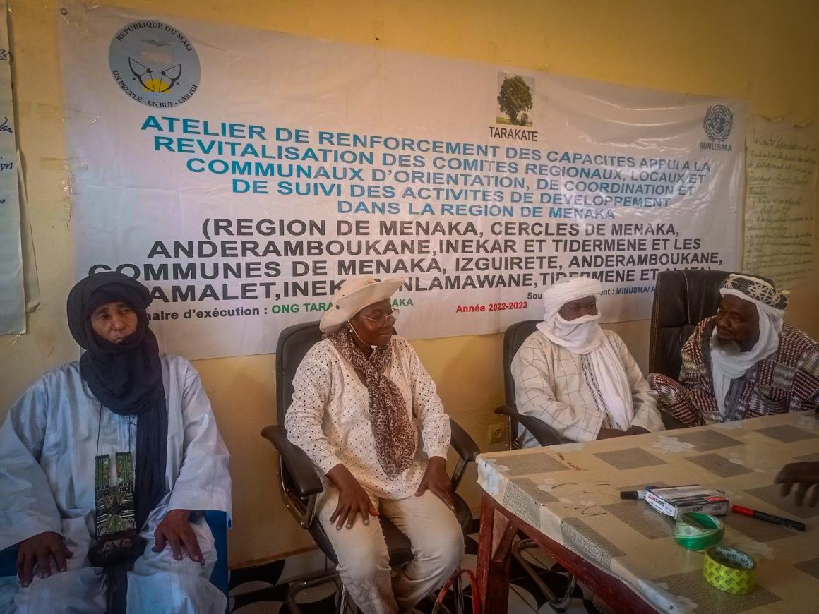 Les Comités Communaux et les Comités Locaux d’Orientation, de Coordination et de Suivi des Actions de Développement (CCOCSAD et CLOCSAD) des communes d'Anderamboucane (région de Ménaka) ont participé à un atelier de renforcement de leurs capacités, du 17 au 19 avril 2023. Organisé par l’ONG TARAKAT, l’atelier a été financé par la MINUSMA. Il a permis à 40 participant(e)s dont quatre femmes, d’échanger trois jours durant sur les voies et moyens de parvenir à l’élaboration de plans de développement de leurs localités. Parmi les quarante participant(e)s, l’on comptait des représentants des autorités, des services techniques de l'État, des partenaires techniques et financiers, ainsi que des membres de la société civile.