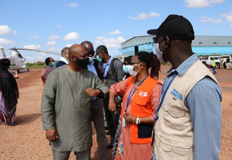 C’est sur le tarmac de l’aéroport Ambodédjo de Mopti que la Cheffe du Bureau régional de la MINUSMA, Mme Fatou Dieng THIAM, accompagnée des chefs des sous-bureaux des agences onusiennes a accueilli M. NOUDEHOU et sa délégation.