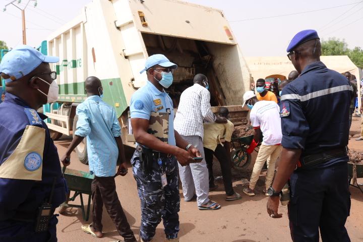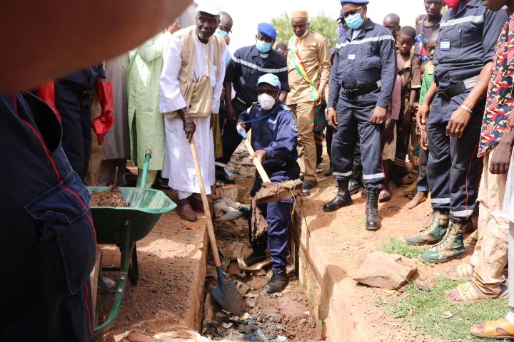 L’opération de curage des caniveaux dans la région de Mopti a été lancée le lundi 29 juin 2020 par le représentant du Gouverneur de la Région de Mopti, Ousmane Diallo, au niveau du rond-point du monument Aly Maiga à Sévaré et en présence du Commandant Régional d’UNPOL, le colonel Jean-Pierre Nyandu Kashabali. Une activité qui selon lui, entre dans les objectifs de la mise en œuvre du projet "Police de Proximité" qui bénéficie de l’appui total de la MINUSMA.