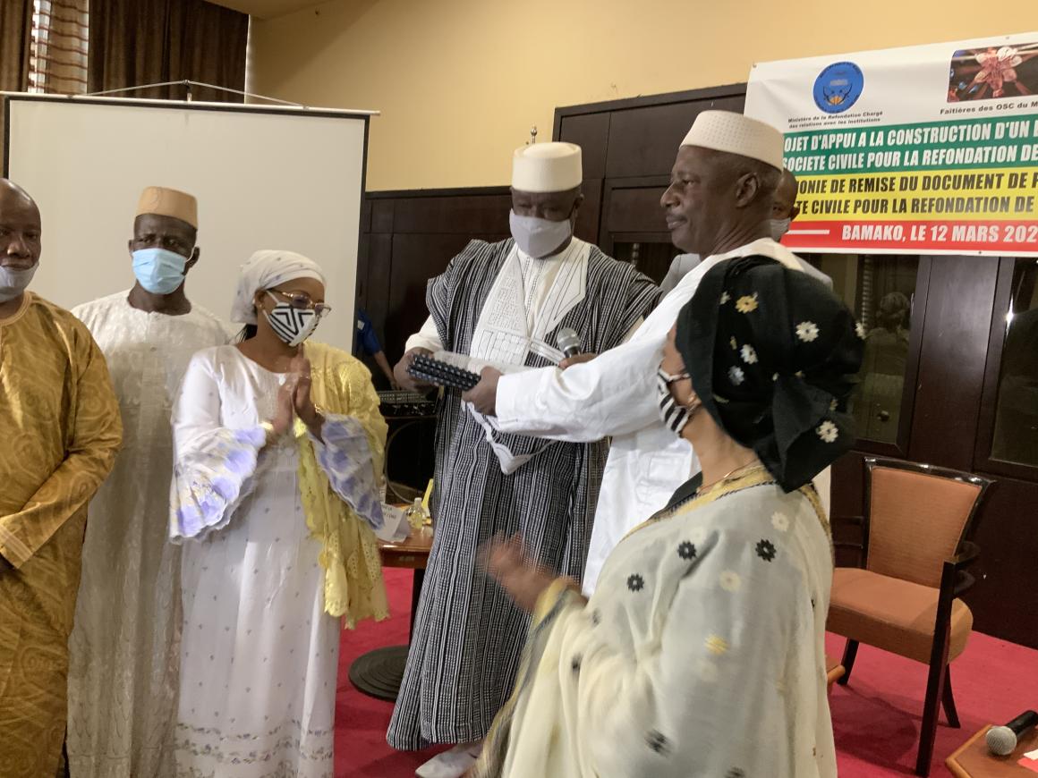 La cérémonie de remise du document de positionnement des Organisations de la Société civile pour la refondation de l’Etat et une transition réussie au Mali a eu lieu le 12 mars dernier à Bamako. Ce document est le point d’aboutissement du « Projet d’appui à la construction d'un engagement commun des organisations de la société civile pour la refondation de l'Etat et une transition réussie au Mali » lancé le 26 février 2021.