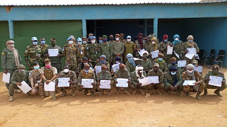 Présidée par le Colonel-major T. KONE, qui dirige le poste de commandement interarmées de théâtre (PCIAT) dans la région de Gao, et par le Commandant adjoint du secteur Est de la Mission onusienne sur place, le Colonel Alfons Fahmy MIKHAEL, la cérémonie de remise des certificats de participation vient clôturer deux semaines de formation. Durant ces 15 jours, les stagiaires ont entre autres participé à des séances d’initiation à la maîtrise des dispositifs explosifs improvisés, à la conduite des patrouilles motorisées et pédestres coordonnées, aux exercices d’embuscades et de maniement d’armes. L’installation, la protection et la défense d’une base d’opération temporaire, ainsi que le renforcement des capacités d’analyse, de planification, de commandement et de renseignement, ont également été étudiés.