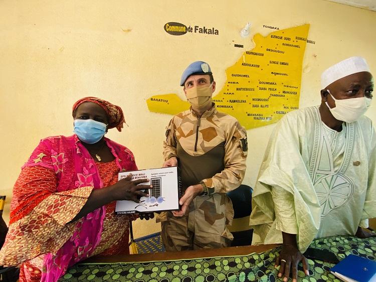 Après s’être assurée que toutes les entités présentes, parmi lesquelles le président du conseil communal des jeunes, la représentante du Réseau des Communicateurs traditionnels pour le développement (RECOTRAD) ainsi que l’un des représentants de médias, aient pu s’exprimer, la Cheffe de Bureau et le Commandant de la Force ont symboliquement remis au représentant du Maire et à la présidente de la CAFO, des kits de seize radios intégrant chacune des lampes électriques, une torche et un mini-panneau solaire, y compris des ports et câbles de recharges de téléphones portables.