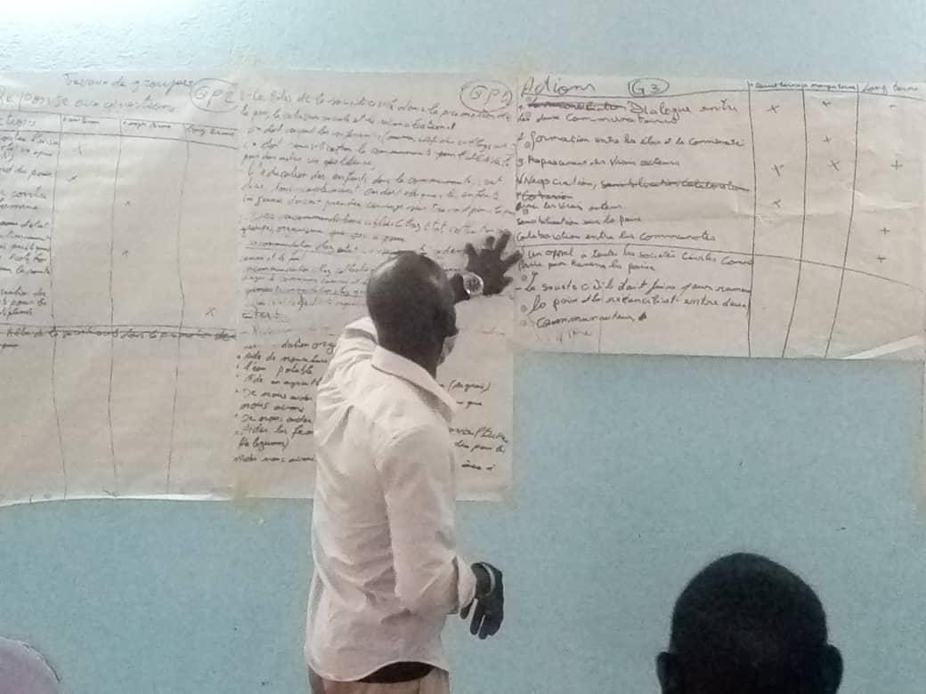 Les représentants des communautés de Pignari Bana et Sangha, ont rejoint la caravane, respectivement les 12 et 13 avril derniers. À l’instar des autres communes représentées, lors des travaux en groupe, ils ont ensemble réfléchi sur les actions concrètes à mener pour contribuer à la réconciliation et au vivre-ensemble dans leurs communautés respectives, y compris la valorisation des bonnes pratiques et des initiatives locales. En ce qui concerne le rôle de la société civile, les participants ont proposé la mise sur pied d’initiatives visant à détourner les jeunes de l’extrémisme violent, à faciliter le travail des acteurs et des partenaires appuyant le processus de paix et de réconciliation, et éventuellement servir d’intermédiaire entre des parties en conflits, selon le cas.