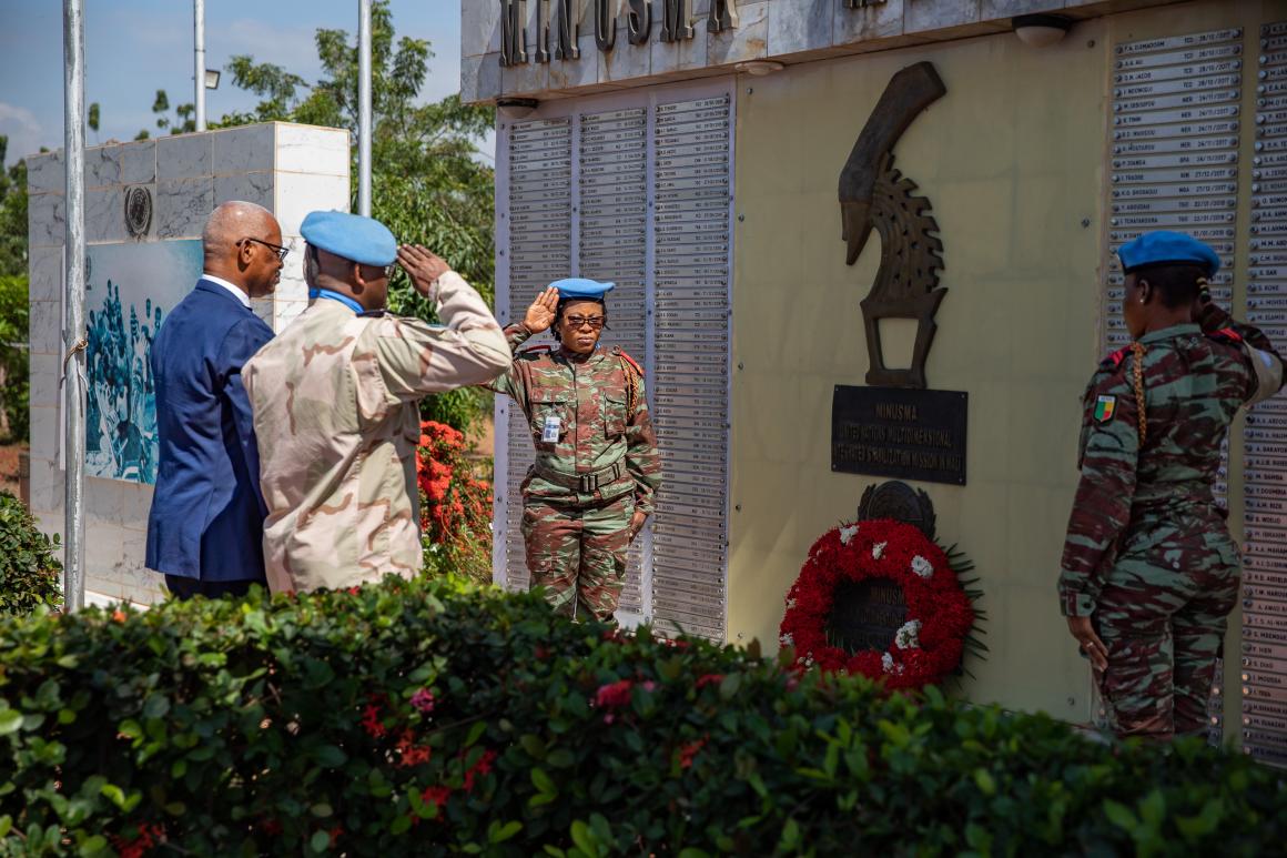 La MINUSMA est la mission de paix des Nations unies la plus dangereuse pour les Casques bleus. Depuis son lancement en 2013 à nos jours, 171 soldats de la paix ont perdu la vie dans l’exercice de leur fonction. Devant le monument aux morts, El-Ghassim WANE a rendu hommage à la mémoire de toutes les victimes de la crise au Mali – Maliens et étrangers, civils et corps en uniforme confondus. « Prenons un moment pour regarder les nombreux noms gravés sur le monument devant nous. Tous ont quitté leur foyer pour tenter de rendre le monde, et le Mali, un endroit plus sûr. Saluons leur mémoire et puissent leur dévouement continuer à nous inspirer dans notre travail quotidien ».