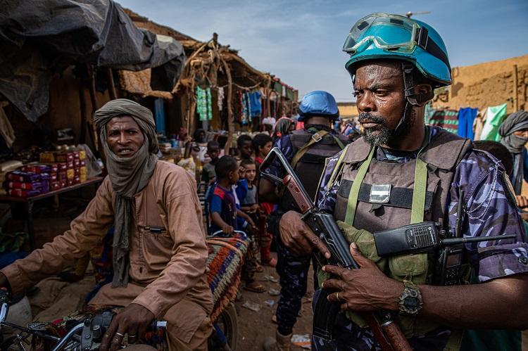 Pour le Chef d'Escadron Léandre N’TSOUGAN de la police des Nations unies (UNPOL) basé à Ménaka, le mot d’ordre reste le même : sécuriser, être visible et mettre en confiance. Comme tous les jeudis. Les équipes se relaient, mais la détermination reste la même. Ce jeudi, c’est le Sous-lieutenant Raoul Koffi GBADJIDJO qui dirige l’opération. Cet officier de la police nationale togolaise connait la ville et ses habitants. Il est au fait du périmètre à sécuriser et de la complexité des lieux. Depuis septembre 2022, il patrouille tous les jours dans la ville et ses environs, noue des contacts auprès des Ménakois et recueille des renseignements pour mieux mener ses interventions. Il est prêt pour la foire. Ses éléments aussi.