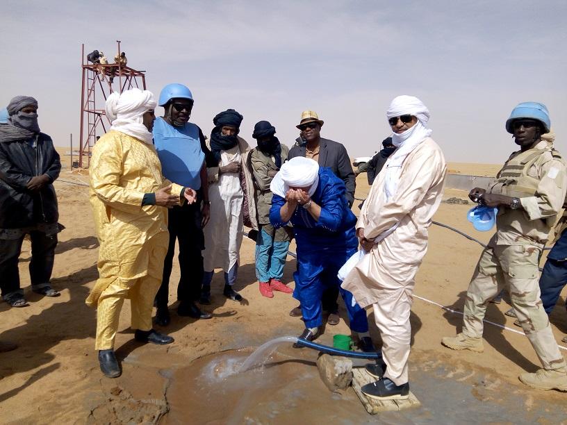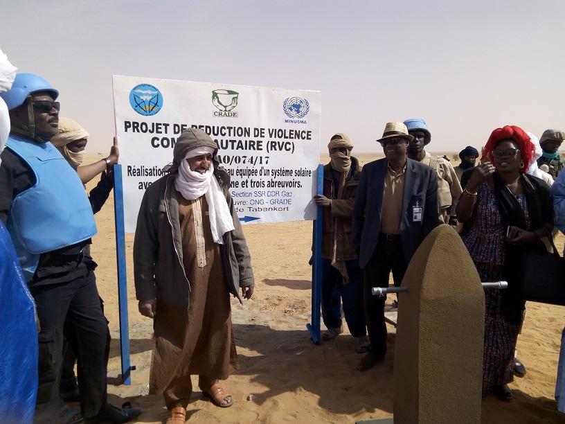 Ce projet concerne le reboisement du site de cantonnement qui a été construit en pleine zone désertique et la réalisation d'une adduction d'eau, équipée d'un système solaire, de trois bornes fontaine et de trois abreuvoirs. Le premier projet va consister à la plantation de plus de 1000 plants d’espèces d’arbres et de plantes qui s’adaptent bien à ce milieu et qui ont une croissance rapide, comme le neem, le terminalia, le prosopis, le henné… Quant au second projet, il va considérablement faciliter l’accès de milliers d’hommes et de femmes à l’eau potable, qui devaient auparavant parcourir des dizaines de kilomètres pour s’approvisionner en eau, avec tous les risques sécuritaires que cela comporte. Le coût total des deux projets est estimé à plus de 62 millions de francs CFA. En outre, il permettra la création de plus de 1100 emplois. « Nous remercions la MINUSMA pour ses nombreuses visites et réalisations de projets chez-nous. C’est grâce à la MINUSMA que nous avons accès aujourd’hui à l’eau, à l’éducation et à la santé, » s’est réjoui M. Omar Ould Hamady, le Chef du village de Tabankort.