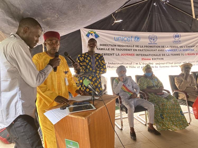 Avec près de 200 participants dont 150 femmes issues de plusieurs organisations et associations féminines de la région, l’évènement était une opportunité pour les femmes leaders de la région de sensibiliser l’opinion sur les conditions précaires des femmes nomades et sédentaires de cette zone. Il a également permis d’établir un bilan sur les progrès réalisés par celles-ci en termes d’égalité des chances dans tous les domaines. « Il est impératif que tous les Maliens, notamment les femmes se donnent la main pour la refondation de notre pays. Je vous invite à plus de rigueur dans vos actions quotidiennes, pour mieux supporter l’autonomisation des femmes et leur pleine participation dans les instances de prise de décision » a souligné Bollé Maouloud BABY, Directeur de Cabinet du Gouverneur de la région de Taoudéni dans son allocution lors de la cérémonie d’ouverture. Celle-ci a notamment réuni le Directeur Régional de la Promotion de la Femme de la Famille et de l’Enfant (DRPFEF) ainsi que les partenaires techniques et financier dont la MINUSMA.