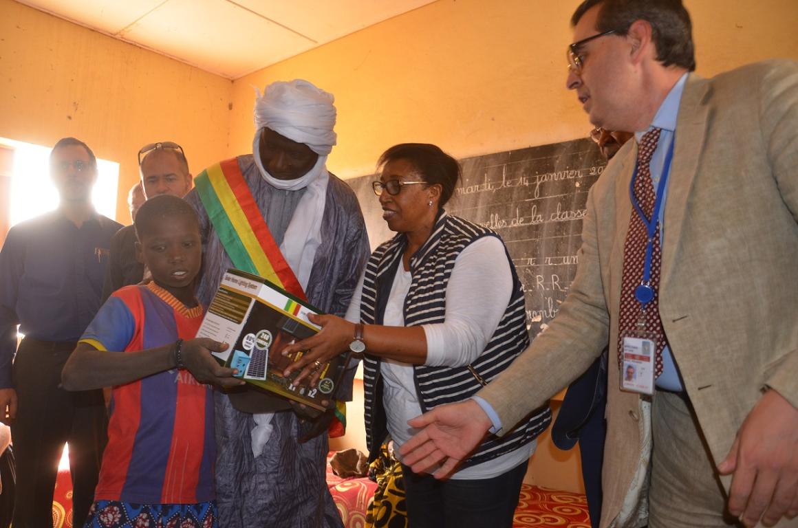 A Bintagoungou, Mme Mbaranga a procédé à un don de kits solaires et scolaires, avant de remettre un autre kit de jardinage aux associations féminines de la ville de Goundam. « Nous vous apportons ces kits scolaires pour encourager les enfants à aller à l’école et les kits solaires pour éclairer le village », a déclaré Mme Mbaranga.