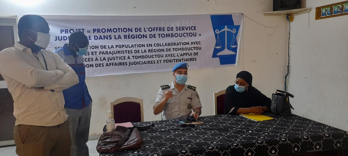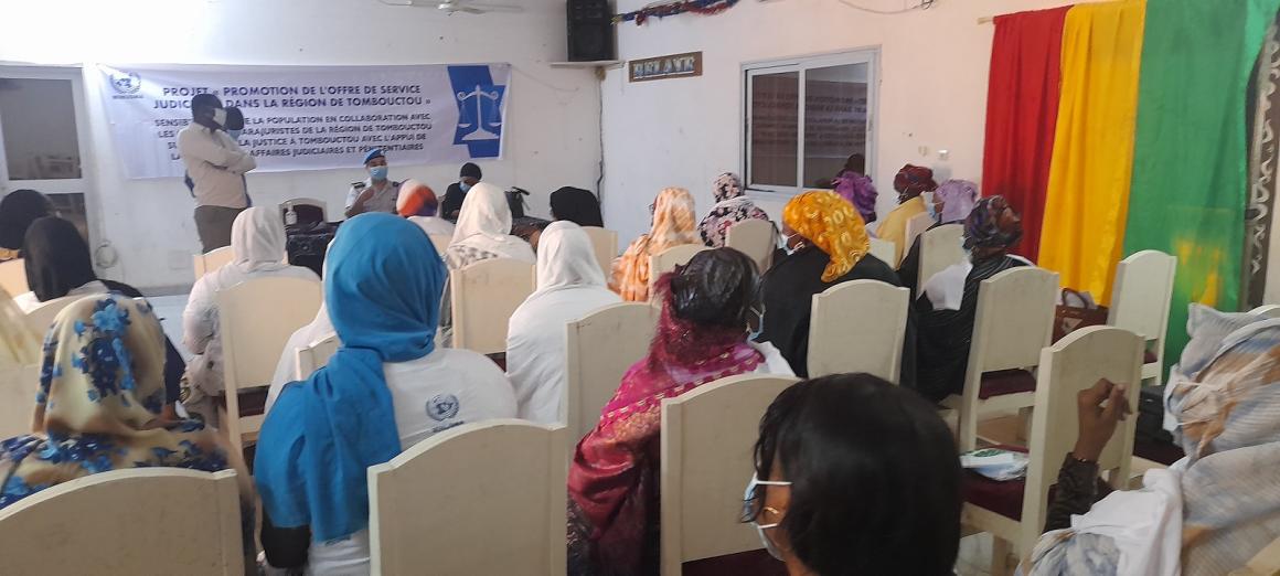 C’est dans ce contexte que la MINUSMA a invité le 17 février à Tombouctou, une trentaine de parajuristes à échanger sur les normes internationales et nationales en matière d’accès à la justice. Cette rencontre a permis aux participant(e)s d’approfondir leurs connaissances en tant que prestataires de service d’assistance juridique. « Notre rôle est d’orienter les usagers des services de la justice, particulièrement les femmes. Cette journée d’échange a servi de rappel pour nous mais aussi d’opportunité d’acquisition de nouvelles connaissances, » a expliqué Niamoye ALIDJI, Présidente de la Clinique juridique DEME-SO de Tombouctou. En français « Maison de l’aide » la clinique juridique DEME-SO a été fondée dans les années 1990, afin de répondre aux besoins juridiques des communautés et personnes vulnérables ne pouvant avoir accès aux services d’un avocat. Ainsi, la clinique assure entre autres, une orientation juridique aux victimes d'abus en matière de droits démocratiques, prévient les abus par l'information et la sensibilisation des populations en matière de Droits civils et civiques ; élabore des modules de formation juridique, ou encore, propose un projet visant l'amélioration des conditions de prévention et de détention au Mali.