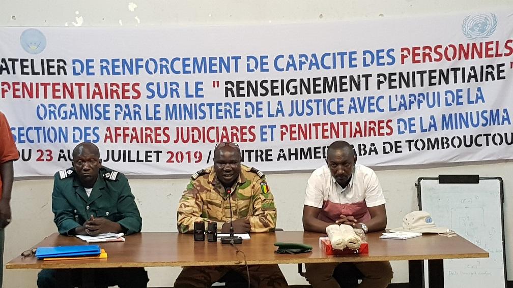 Le Ministère de la Justice, en collaboration avec la Section des Affaires judiciaires et pénitentiaires de la MINUSMA (SAJP) à Tombouctou, a organisé du 23 au 25 juillet, un atelier de renforcement de capacités au profit de 20 Agents de l’Administration pénitentiaire de la région. La rencontre s’est déroulée au Centre Ahmed Baba, sous le thème : « Contribution du Renseignement pénitentiaire dans la prévention et la lutte contre le terrorisme dans la Région de Tombouctou ». Le Directeur régional de l’Administration pénitentiaire et de l’Education surveillée (DRAPES) ainsi que des représentants de la SAJP de la MINUSMA à Tombouctou étaient également présents.