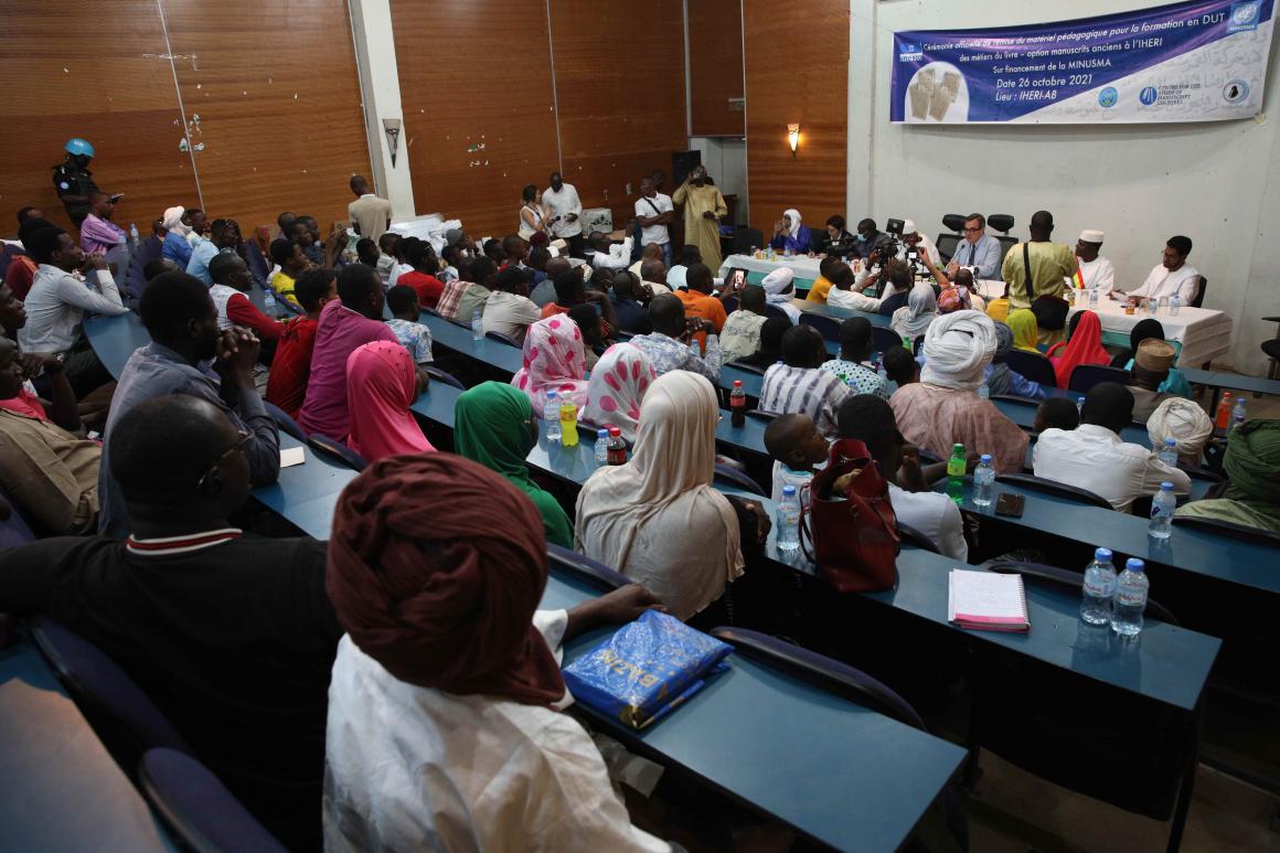 Depuis 2013, l’UNESCO et la MINUSMA sont engagées dans la sauvegarde du patrimoine culturel du Mali. Cet engagement s’est traduit par la reconstruction des mausolées, la réhabilitation et la rénovation de six bibliothèques de manuscrits, dont trois ont été entièrement financées par la MINUSMA. Ces efforts sont soutenus par le Centre pour l’Etude des Cultures Manuscrites (CSMC) basé à Hambourg, en Allemagne.