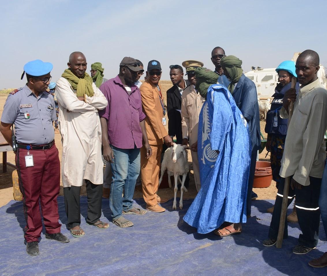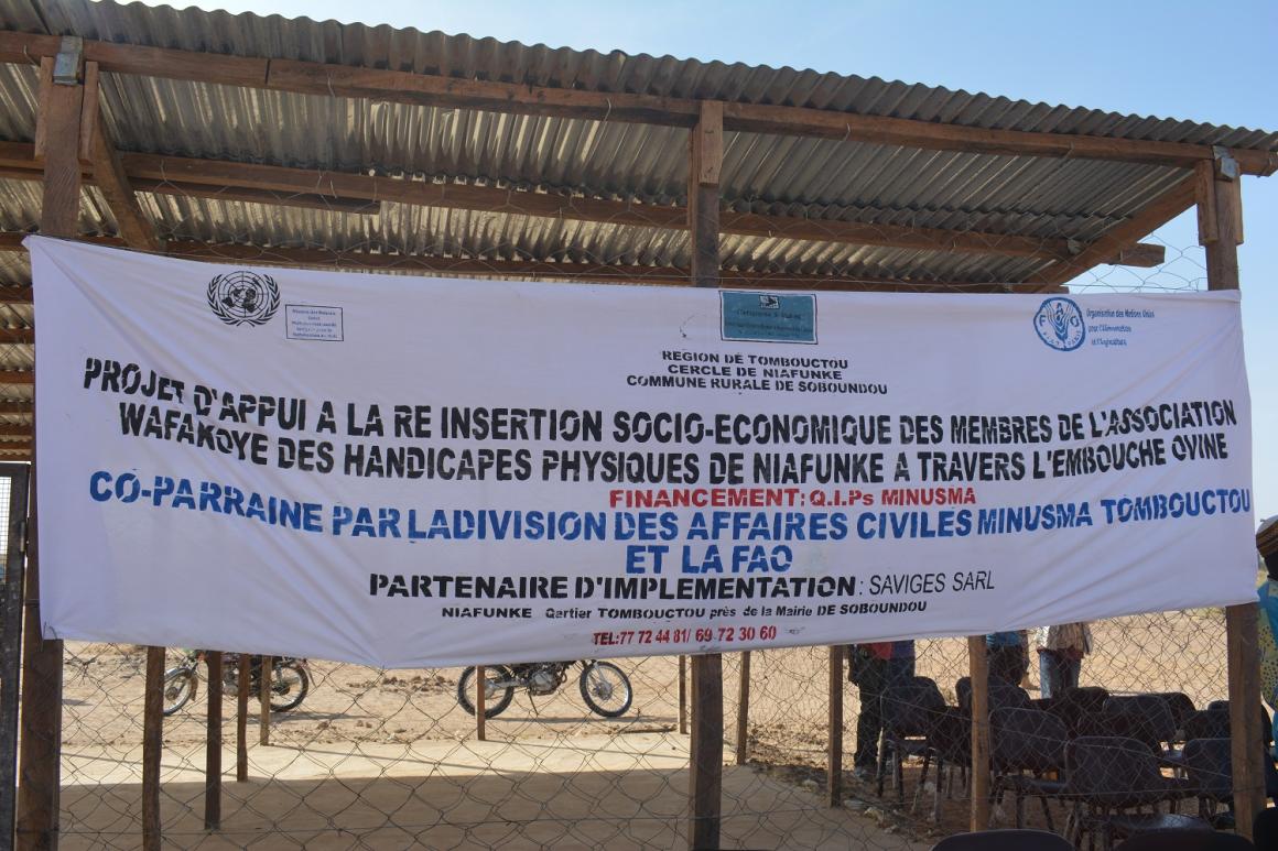 Le 15 février dernier, la Division des Affaires civiles du bureau de la MINUSMA à Tombouctou a officiellement remis un projet d’appui à la réinsertion socio-économique aux membres de l’Association Wafakoye. Basée à Soboundou, dans le cercle de Niafounké, elle regroupe 87 membres, dont 26 femmes, vivant avec un handicap physique. Ce projet à impact rapide d’une valeur de plus de 10 millions de francs CFA (exactement 10 500 000 FCFA) vise à accroitre le revenu des bénéficiaires à travers l’activité d’embouche ovine et permettre à ces habitants de profiter des dividendes de la paix.