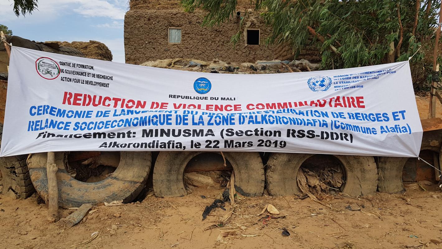 Le Bureau régional de la MINUSMA, à travers sa section de la Réforme du Secteur de la Sécurité et du Désarmement, de la Démobilisation et de la Réinsertion (RSS-DDR), a procédé le 22 Mars dernier, au lancement officiel du "Projet de restauration des berges et de relance socioéconomique de la zone d’Alkorondiafia/Koriomé". Ce projet vise à réduire les violences communautaires par la restauration de l’environnement et la création d’un espace propice au développement des activités socioéconomiques des jeunes et des femmes du site d’Alkorondiafia et environnant.
