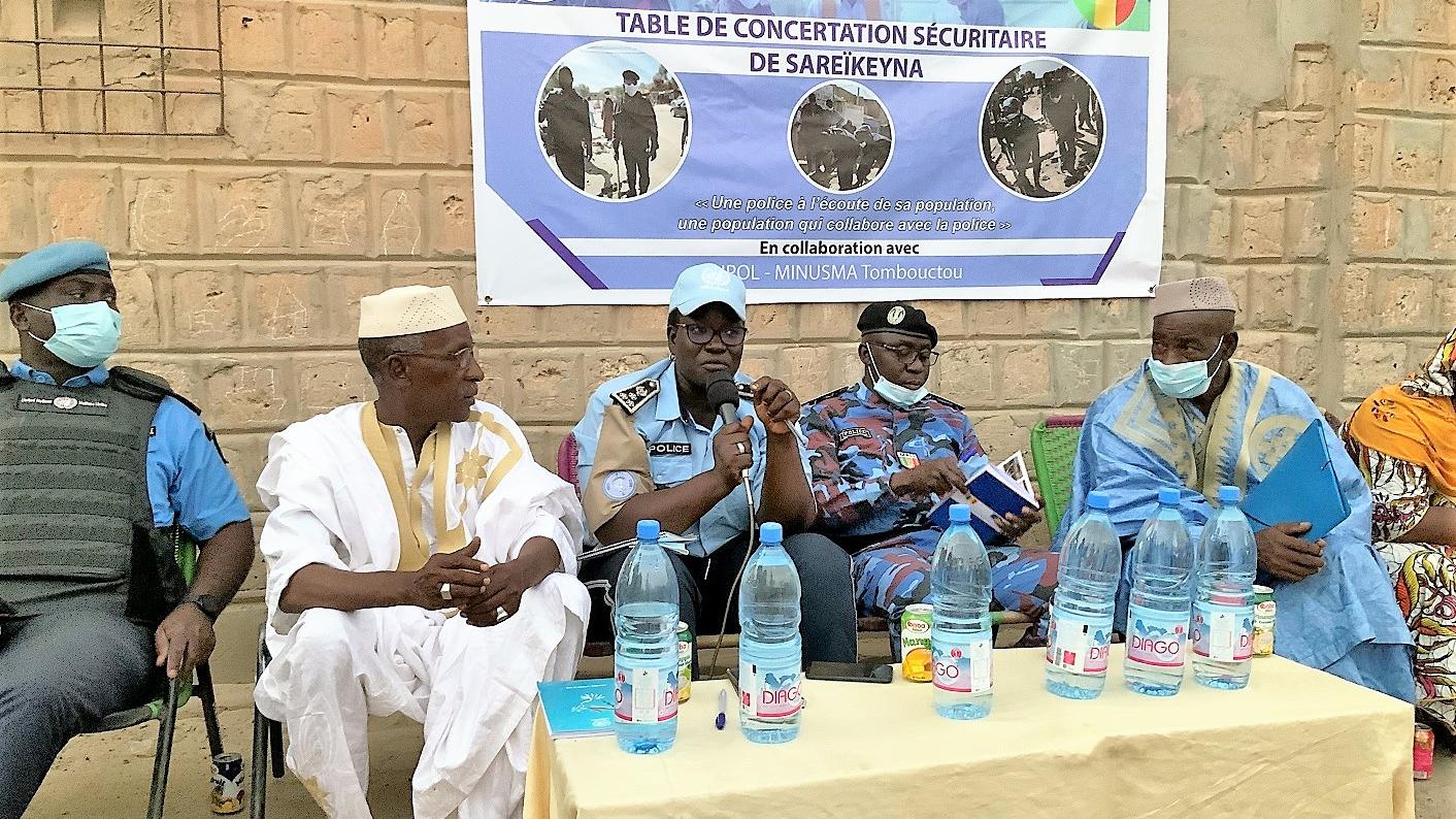 Le Commissaire de Police Broulaye COULIBALY, Adjoint au chef de service du Commissariat de Police de la ville de Tombouctou a souhaité que ce type d’échanges se déroule dans tous les quartiers de Tombouctou. Il a ensuite pris acte des préoccupations exprimées par le public et a exhorté la population à faire confiance aux forces de l’ordre. La Commandante de l’UNPOL Sanou DIOUF dans la région de Tombouctou a, pour sa part, expliqué que la Police travaille jour et nuit au péril de sa vie pour protéger les civils. Consciente qu’il reste beaucoup à faire, elle a indiqué que cette rencontre a pour but de mieux comprendre les préoccupations des usagers de la Police afin d’y apporter les meilleures solutions. Elle a toutefois demandé au public de faire preuve de patience et d’indulgence avant de les inciter à une grande proximité avec la police pour le bien de tous.