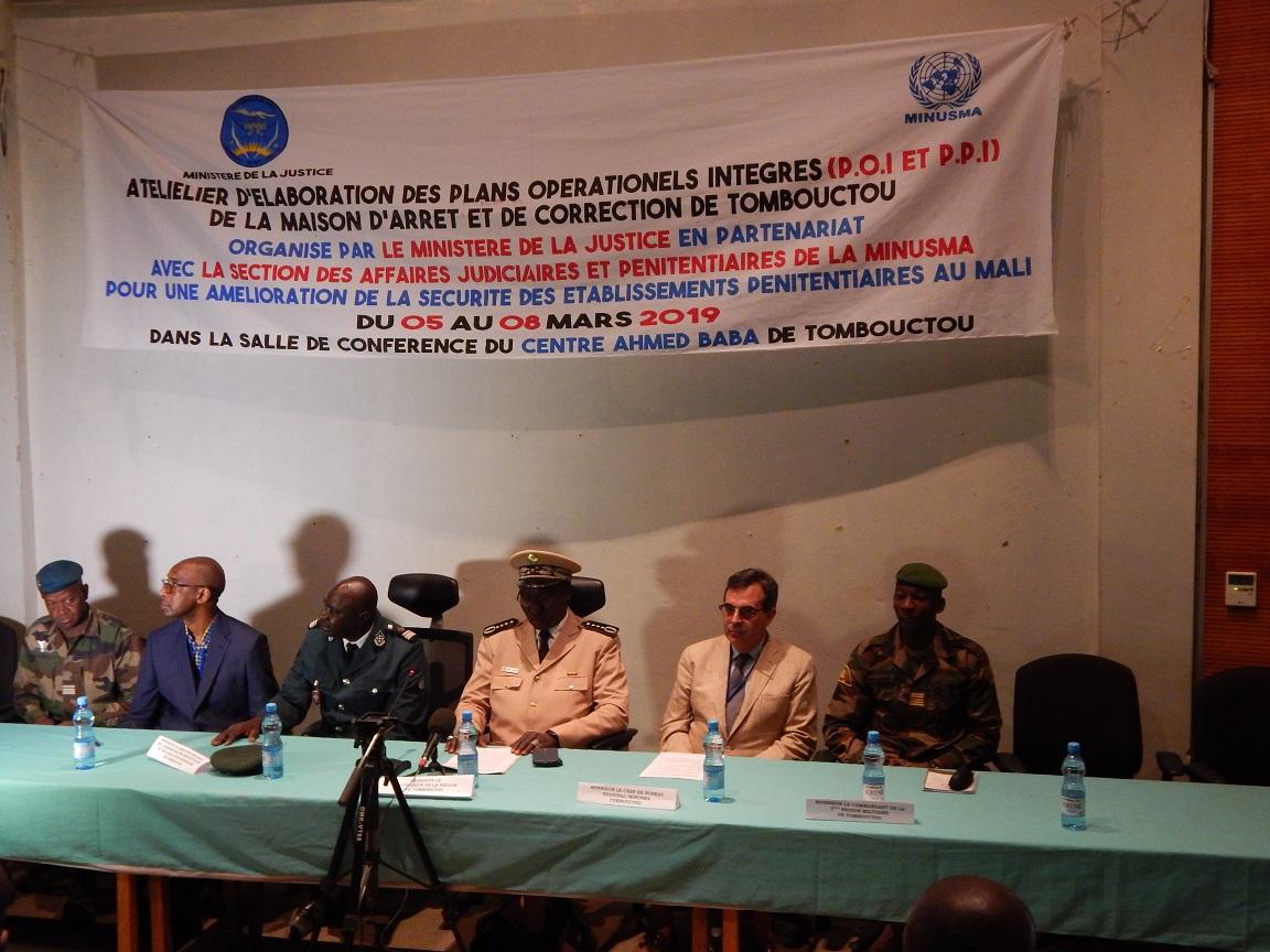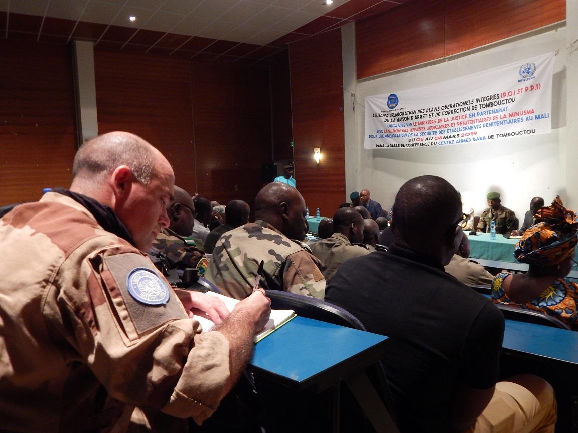 Le Bureau régional de la MINUSMA à Tombouctou, à travers sa Section des Affaires Judiciaires et Pénitentiaires (SAJP) a organisé, du 5 au 8 mars derniers, un atelier d’élaboration du plan intégré de protection et de défense, comprenant le Plan Opérationnel Intérieur (P.O.I) et le Plan de Protection et d’Intervention (P.P.I), pour la Maison d’Arrêt et de Correction de la ville de Tombouctou. L’objectif était de renforcer la protection interne et externe de la Maison d’Arrêt et de Correction en cas de graves incidents.