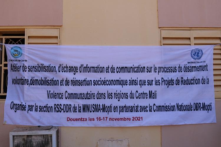 Un important atelier de sensibilisation, d’échanges, d’information et de communication sur le processus de désarmement volontaire, démobilisation et de réinsertion socio-économique ainsi que sur les projets de Reduction de la Violence Communautaire dans la ville de Douentza, a eu lieu les 16 et17 novembre derniers. Cet important échange a été animé par le Bureau de la MINUSMA à Mopti à travers la Section Réforme du Secteur de la Sécurité/Désarmement Démobilisation et Réinsertion (RSS/DDR).