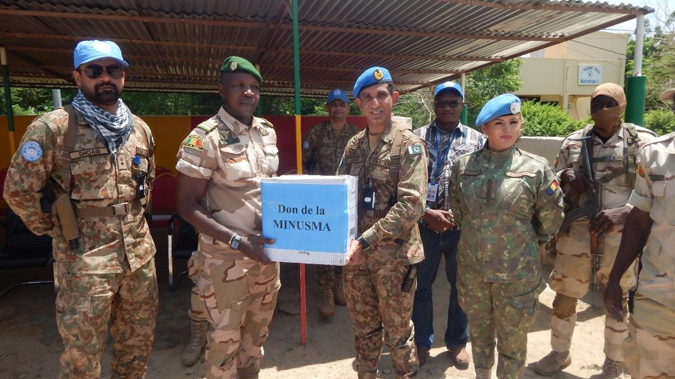 À Tombouctou, les Casques bleus de la Force de la MINUSMA on fait un don symbolique à leurs frères d’armes des Forces armées maliennes (FAMa). Dit de fraternité, ce don composé de vivres leur a été remis lors d’une brève et sobre cérémonie au Camp FAMa de Tombouctou le 20 septembre 2022.