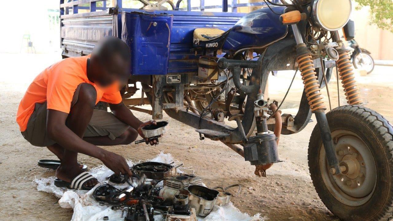 À quelques mètres de Youssouf, un autre détenu s’active devant le moteur détaché d’un tricycle. Tout comme lui, il a bénéficié d’une formation grâce à un projet de réinsertion et entend bien continuer dans la mécanique.