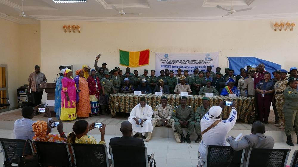 Soutenue par la MINUSMA, ONUFEMMES et l’IMRAP (Institut malien de recherche-action pour la paix), cette session de formation de quatre jours consiste à apporter un appui à la DNAPES dans le cadre global de la sécurisation des établissements pénitentiaires des régions de Kayes, Koulikoro, Sikasso, Ségou, Mopti, Tombouctou, Gao et du District de Bamako. Elle entend contribuer aussi à l'amélioration de la gouvernance des institutions de sécurité, notamment par la mise en œuvre de l’arrêté interministériel du 4 aout 2017, fixant les conditions d'application du plan intégré de protection et de défense des établissements pénitentiaires et de l'éducation surveillée pour renforcer la sécurité des établissements concernés. « Ce regroupement a été rendu possible grâce aux différents soutiens de la MINUSMA, à travers sa composante UNPOL et la Section des Affaires Judiciaires et Pénitentiaires, d’ONUFEMMES et de l’IMRAP. Il permettra de créer la cohésion et l’intégration entre les femmes des forces de défense et de sécurité et de l’administration pénitentiaire, à travers le renforcement de leurs capacités sur des modules comme la gestion des prisons et les instruments juridiques, les droits de l’Homme en milieu carcéral, la radicalisation en milieu carcéral et l’extrémisme violent, la police de proximité, » a déclaré Lamissa BERTHE, Directeur régional de l’administration pénitentiaire.