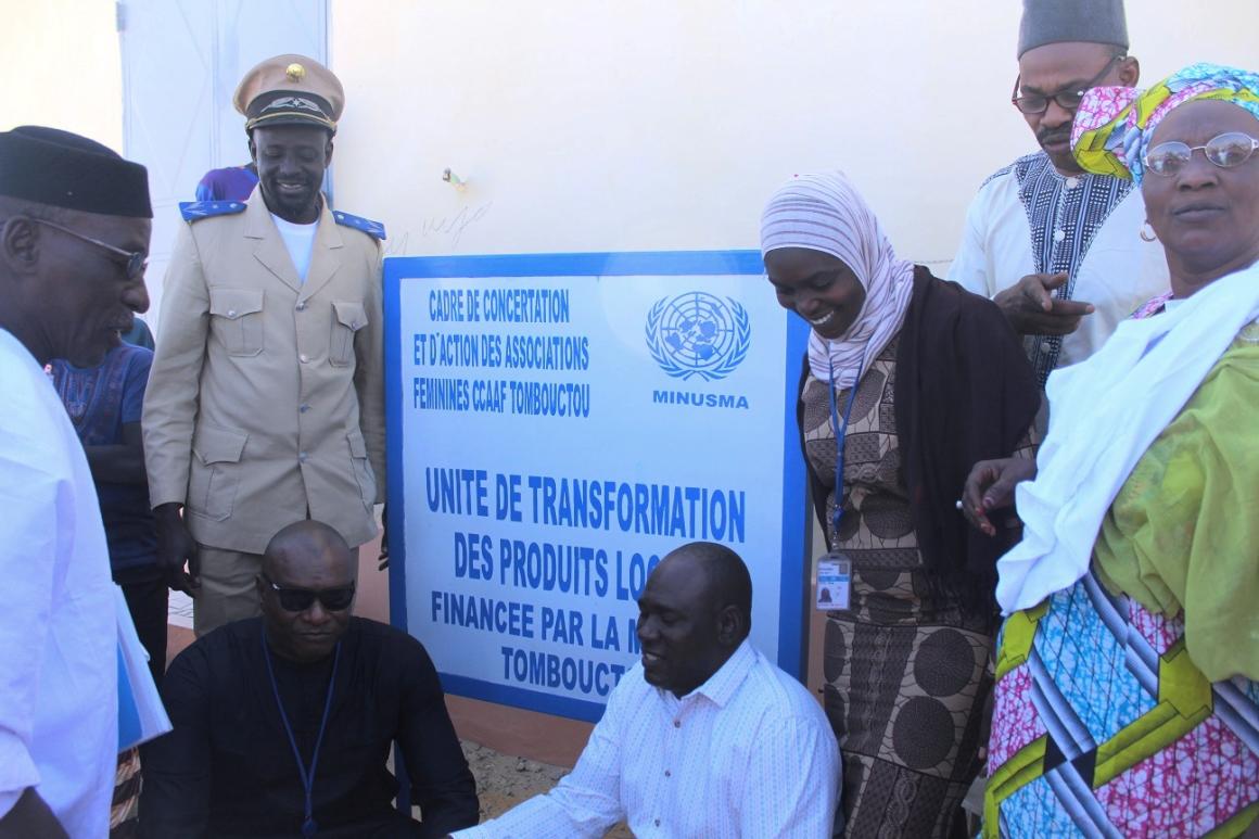 Le 8 février 2017, la MINUSMA a inauguré l’unité de transformation des produits locaux au profit du Cadre de Concertation et d’Action des Associations Féminines (CCAAF), une structure qui regroupe huit associations. La construction et l’équipement d’une unité de transformation des produits locaux, destinée à ses femmes de Tombouctou, entre dans le cadre des Projets a Impact Rapide (QIPs). D’un coût de près de 27, 8 millions de Francs CFA, financé par la Mission onusienne, ce projet vise à permettre aux femmes de la commune urbaine de Tombouctou de reprendre leur activité génératrice de revenus, dans de meilleures conditions et à favoriser leur insertion socio-économique.