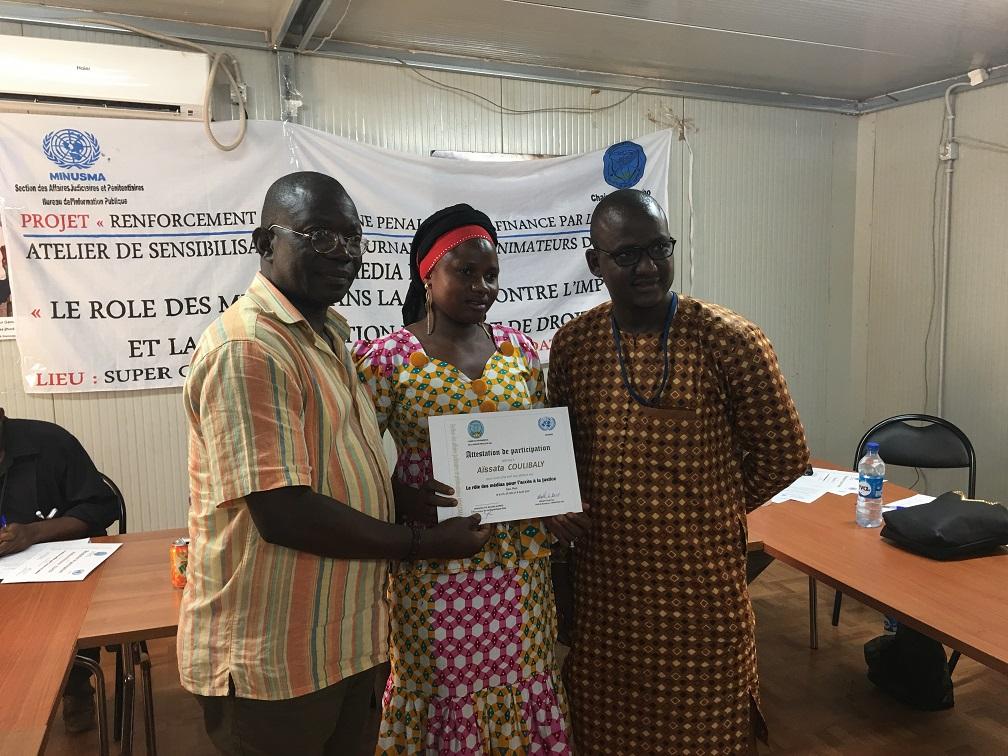 Yacouba Dicko de la Radio AADAR-Koima et Mohamed Boncana de la Radio Naata ont gagné des smart phones (téléphones intelligents) avec logiciel de navigation dans la catégorie "reportage" et "table ronde", tandis que d’autres participants ont remporté des dictaphones. « Je vous félicite pour l’engagement et la constance dont vous avez fait montre pendant cette série d’ateliers. Nous suivons vos différentes émissions et le thème relatif à la justice est revenu trop souvent. En outre, nous remarquons tout l’intérêt que les populations accordent maintenant à vos émissions,» a indiqué le Chef de la Section des Affaires Judiciaires et Pénitentiaires de la MINUSMA.