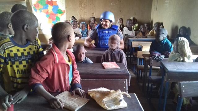 Dans la salle de classe, les élèves affichent un grand sourire dès que les Casques bleus font leur entrée. S’en suit un échange direct entre les gardiens de la paix et les élèves, échange auquel leur enseignante assiste. « Je veux devenir enseignante pour contribuer au développement de mon pays, » lance Houreirata Mahamadou, 12 ans. « Je souhaite bonne chance à la MINUSMA pour ce qu’elle fait chez nous, » ajoute-t-elle en langue Sonrhaï.