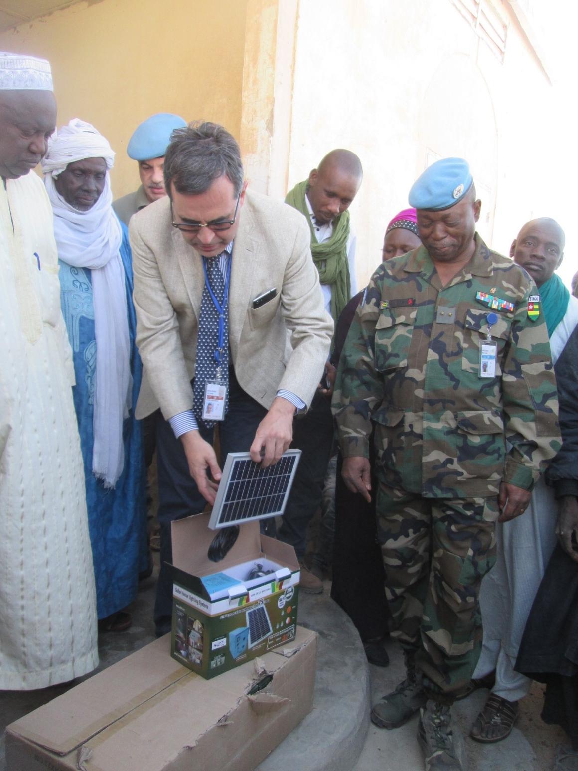 Afin d’améliorer les services de santé durant la nuit, le Chef de bureau de la MINUSMA a remis au Maire de la commune un kit solaire provenant des projets des dividendes de la paix de la lancés en novembre dernier. “Ce système solaire permettra de répondre aux besoins de nos malades à toute heure”, a déclaré le maire en remettant le matériel au technicien de santé, après l’avoir reçu du Chef de Bureau de la MINUSMA. La délégation, accompagnée des autorités locales, a visité les locaux du CSCOM ainsi que l’ancienne citerne d’eau défectueuse, avant de s’envoler pour Tombouctou.