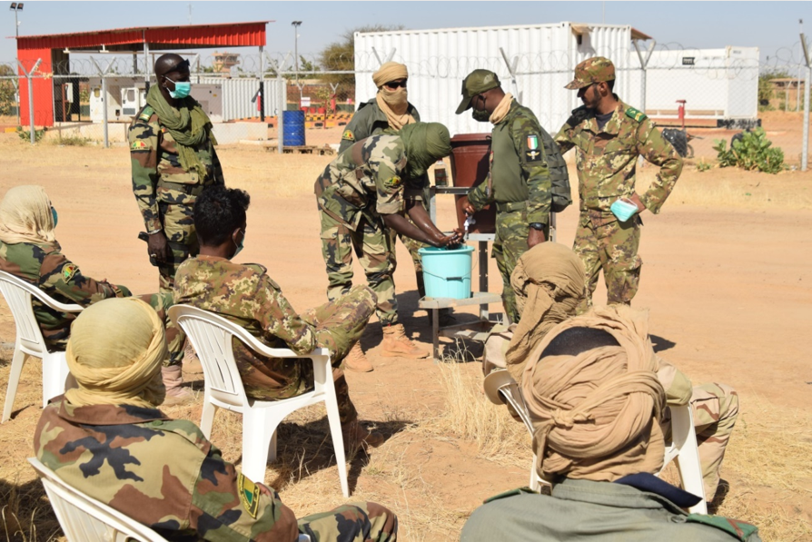 La cérémonie d’ouverture de cette session de formation a eu lieu le 10 novembre dernier au Camp de la MINUSMA à Tombouctou, en présence du Général de Brigade Wael SHAWKY, Commandant du Secteur Ouest, de ses collaborateurs et de la délégation malienne conduite par Colonel Boubacar Yanssary SANOGOH, Commandant la 5ème Zone de Défense de Tombouctou. Dès leur arrivée les 40 éléments de la 1ère Section de la 2ème Compagnie du BFAR ont été sensibilisés sur les mesures barrières contre la propagation de la COVID-19, par le Médecin-chef de l’Hôpital de Niveau 1 du Bataillon ivoirien. Ils se sont également vu remettre des kits de formation.