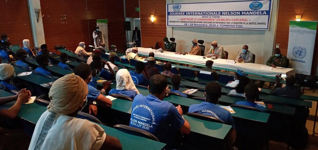 En raison de la crise sanitaire liée à la COVID-19, la célébration de la Journée Internationale Nelson Mandela pour les droits des détenus qui se tient tous les 18 juillet de chaque année, a été reportée au mois de décembre, dans les bureaux régionaux de la MINUSMA ainsi qu’à Bamako. Avec pour thème : « agir pour le changement en milieu carcéral », elle a pris différentes formes de Bamako à Gao en passant par Tombouctou et Mopti. Partout, les Directions régionales de l’Administration pénitentiaire et de l’éducation surveillée (DRAPES), les acteurs de la chaîne pénale, les autorités administratives locales, les élus, la société civile, les détenus se sont unis avec l’appui technique et logistique de la MINUSMA, à travers ses équipes régionales de la Section des affaires judiciaires et pénitentiaires (SAJP), pour rappeler l’importance des "Règles Nelson Mandela".
