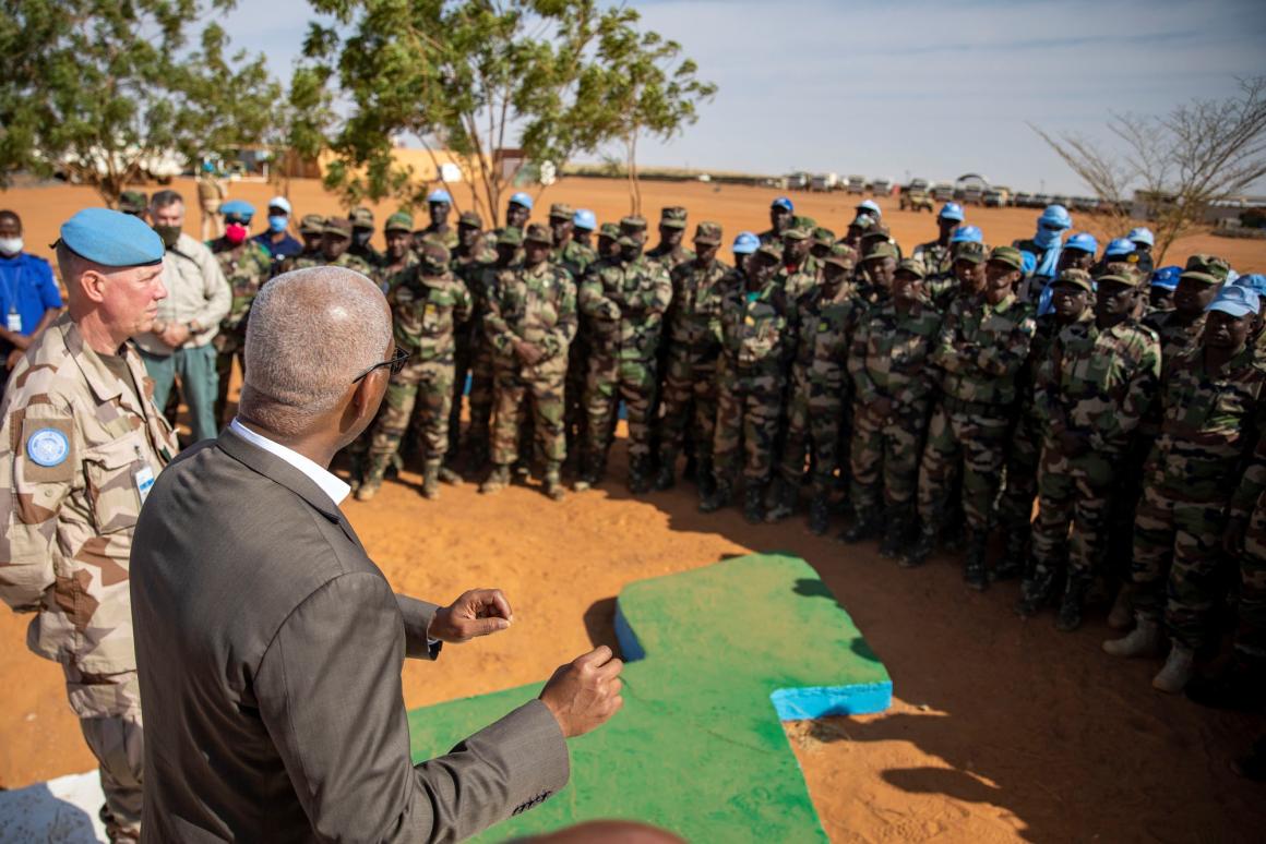 À Ménaka, où le camp de la MINUSMA a été la cible d’une attaque le 4 décembre dernier, El-Ghassim WANE s'est d'abord entretenu avec ses collègues civils, avant de rencontrer les éléments de l’Unité de police constituée du Togo, dont il a salué les efforts. Il a saisi l’occasion pour leur présenter ses condoléances à la suite de la perte de sept de leurs compatriotes Casques bleus, tombés le 8 décembre dernier dans la région de Mopti. Il s'est ensuite entretenu avec le commandement du bataillon du contingent nigérien présentement en rotation. Le Chef de la MINUSMA n’a pas manqué de témoigner sa reconnaissance aux partants, qui se sont acquittés de leurs tâches avec dévouement, encourageant les soldats nouvellement déployés à persévérer sur la lancée de leurs camarades d’armes.