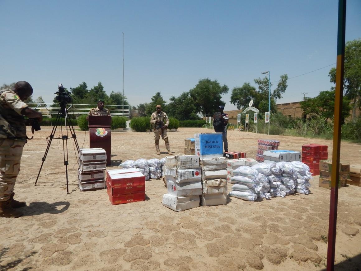 À Tombouctou, les Casques bleus de la Force de la MINUSMA on fait un don symbolique à leurs frères d’armes des Forces armées maliennes (FAMa). Dit de fraternité, ce don composé de vivres leur a été remis lors d’une brève et sobre cérémonie au Camp FAMa de Tombouctou le 20 septembre 2022.