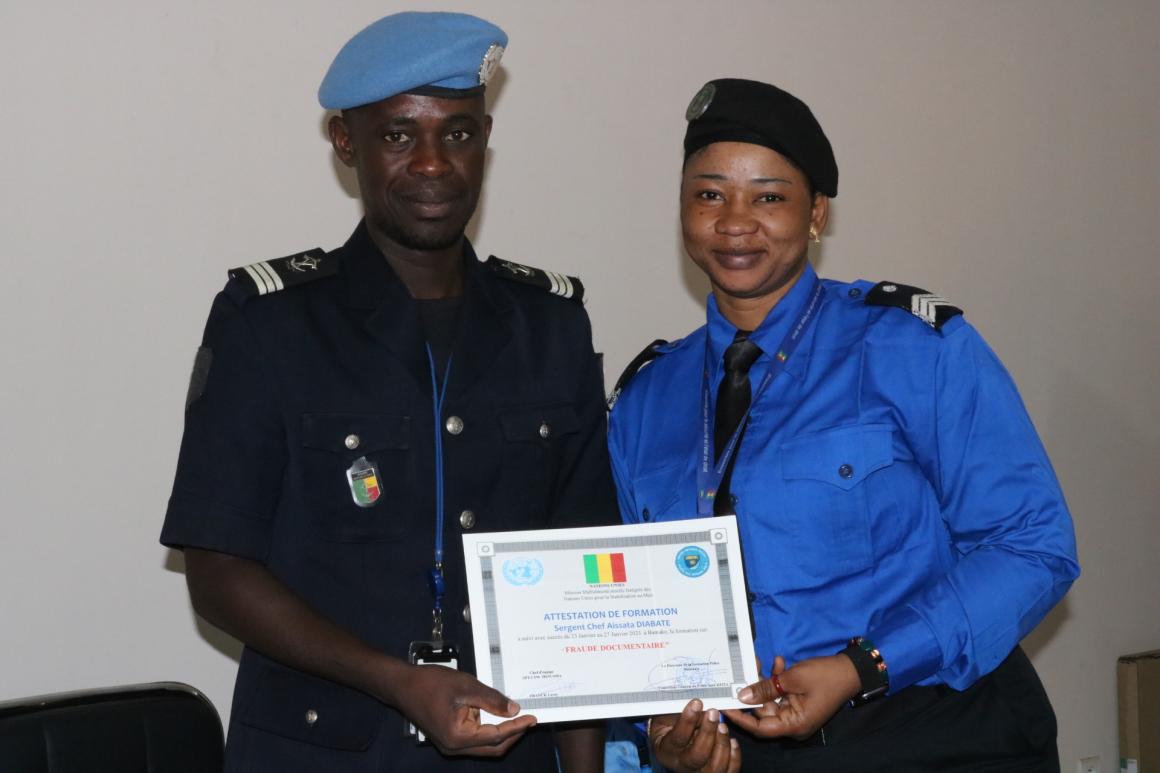Au cours des cinq jours de formation, le Lieutenant de gendarmerie Thierry Raoul OBELE, expert de la Police des Nations unies, et le major Souleymane DIAMOUTENE de la Police nationale du Mali, ont abordé avec les stagiaires les généralités sur la fraude documentaire, la définition et les différents types de documents de voyage. Les documents administratifs et personnels ainsi que la législation malienne en la matière ont été étudiées. De façon pratique, les stagiaires ont été formés sur la lecture des écritures et des signatures sur un document de voyage. Il leur a été enseigné les pratiques et les réflexes à avoir pour la détection de faux documents de voyage. Le Commissariat spécial de la Police de l’air et des frontières de l’aéroport international de Bamako est chargé du contrôle des entrées et sorties des personnes, ainsi que de la sécurité aux frontières aériennes. Cette unité de la police nationale du Mali opère dans un trafic international intense, propice aux activités de criminalité organisée. Pour le commissaire de police Armel AIDOTE de l’UNPOL : « Il faut que nous, forces de sécurité, travaillons ensemble pour mutualiser nos efforts, car les criminels, eux, travaillent ensemble et en bande organisée. Il faut mutualiser les efforts pour freiner l’élan de la criminalité ». Après avoir invité les différentes forces de sécurité à contrer la fraude, le Commissaire de police Abdoulaye TRAORE, représentant le commissaire de l’aéroport a remercié la MINUSMA pour sa collaboration et a souhaité que ces formations spécialisées puissent se poursuivre sur d’autres thématiques.